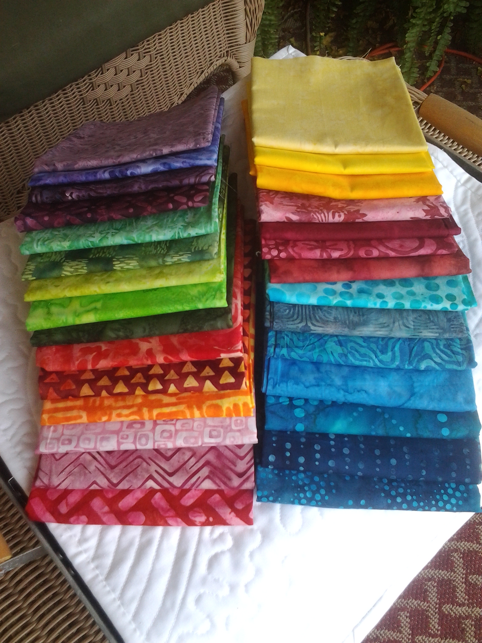 During the Olympics I found myself studying the banners. I love all the color and the use of diamonds instead of a traditional square really got me hooked. So I open up the sketch pad and start drawing. Once the cover to the sketch pad closed that project got put on a back burner. A couple of weeks later I was surfing the web and came across this little gem. Did I mention the pattern is a free download? Visit Hoffman fabrics for more info. There are 29 different Bali batiks in the quilt…which makes this gem a semi-precious stone. It sounded like a great excuse for a trip to the local quilt shop. Now, I’ve got the fabric and I printed my pattern so it’s time to get started.