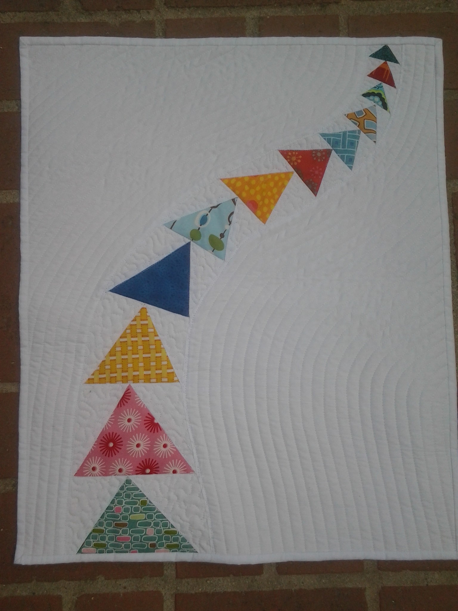 I finished the second class sample this last Sunday. I even remembered to take it to Ventura Modern Quilt Guild on Monday for show n tell. Seeing it float around in the back of my Mini Cooper all week reminded me that I still needed to take a picture of it and get it up on the blog. The curved geese are fun to do and I think it’s going to be a great class.