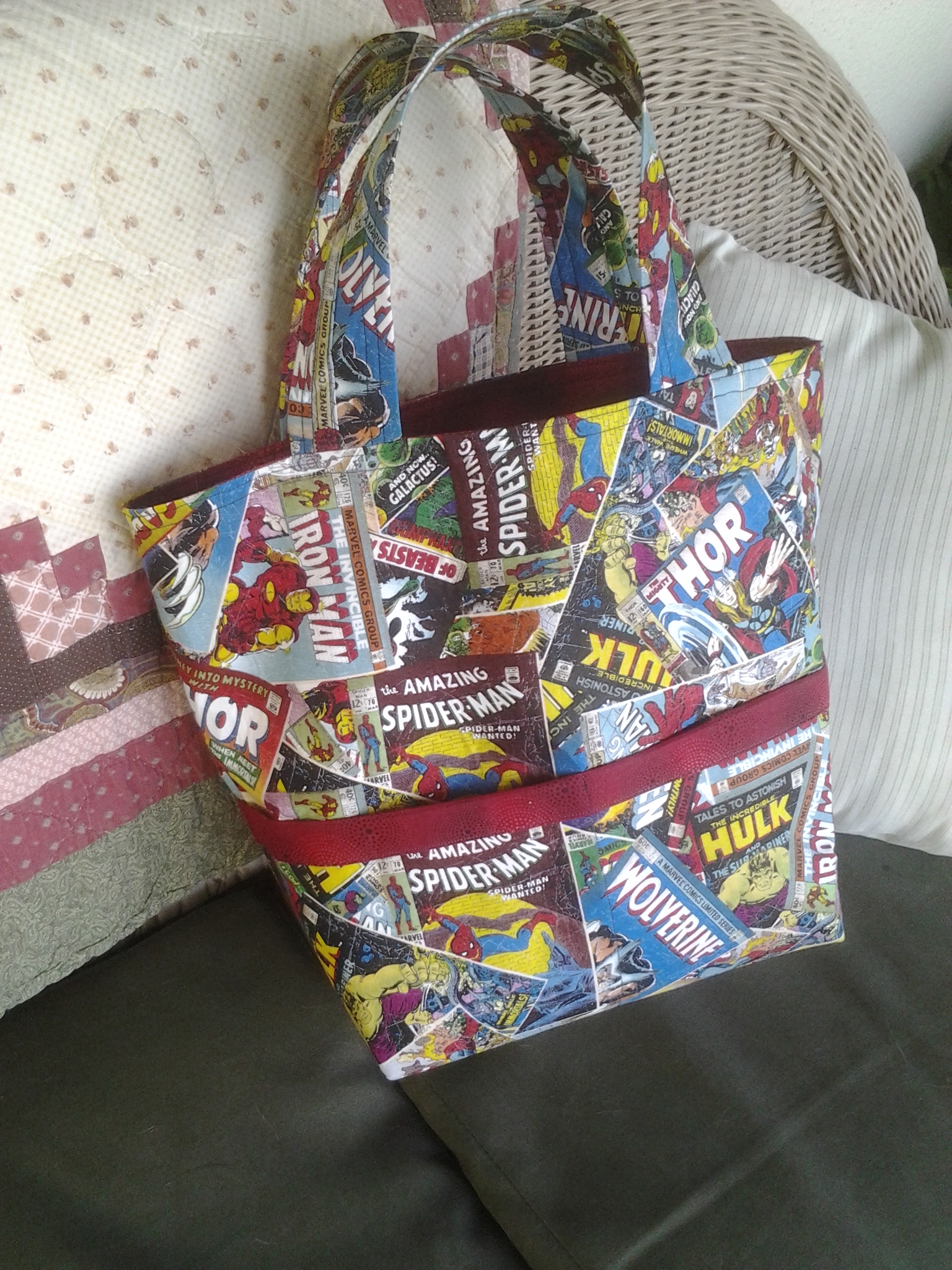 It’s been miserably hot (at least for me) here in Southern California. I’m not too sure about everyone else but when it gets hot, all my creative juices seem to evaporate. There’s plenty to be done but currently the will is lacking. I did manage to get a couple of tote bag samples made for an upcoming class. I started out making a bag from a tutorial I found online and before the bag was even constructed I was already making some changes to the pattern. I’ve had this cute comic book fabric for a while now and was waiting for the appropriate project to incorporate it into. The fabric works well with this tote and I’m pleased with the outcome. However, being able to take a picture of the bag with the crazy winds we’ve had this week has been a real challenge. I would love some feedback…let me know what you think.