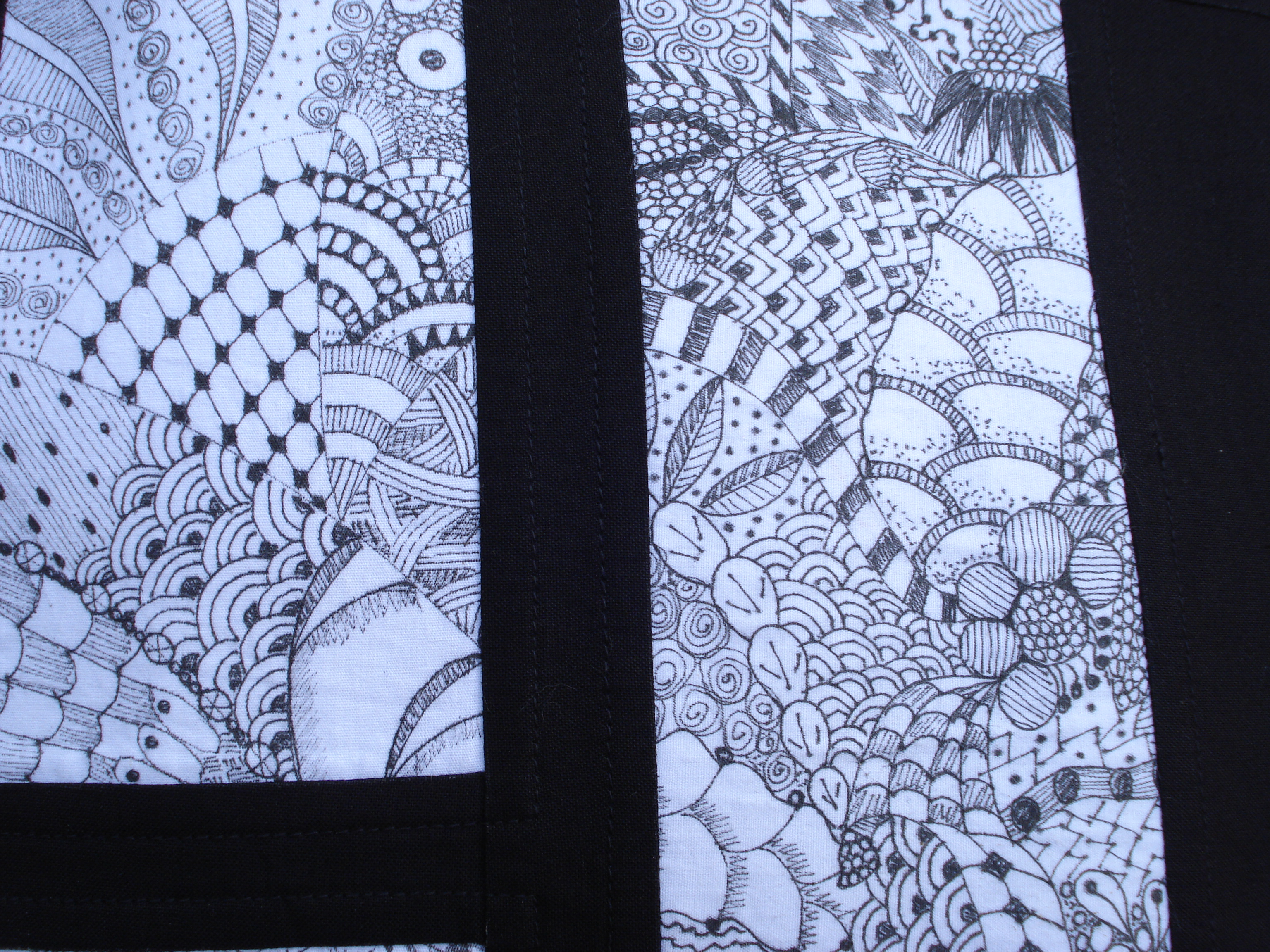 This Zentangle thing is too addictive. Since I can’t sit still and always have the need to feel productive, why not Zentangle? I posted earlier my first ‘tangle’ and several more have followed. Now what to do with these little works of art. When in doubt, make a tote bag. I kept it simple with solid grid lines and chose black as the background color to showcase my designs. I really like how it turned out. Can we ever have too many bags?